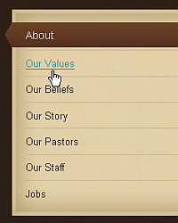 Description: Brown vertical list menu with the selected menu item protruding out with a nice arrow effect.